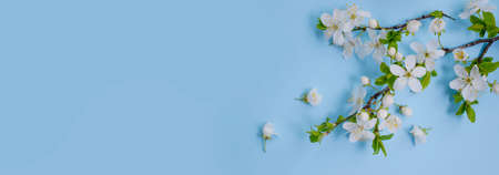 Spring nature background. Beautiful blooming spring twigs on blue background flat lay top view copy space. Springtime concept, flowers composition, bloom delicate white flowers with green leaves.