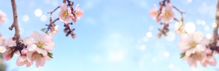 Beautiful Pink Sakura flowers, cherry blossom during springtime against blue sky, banner size