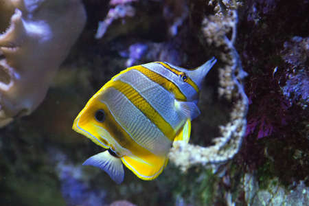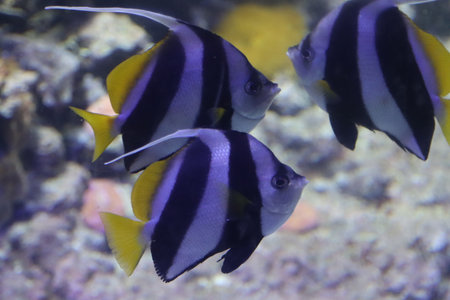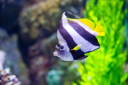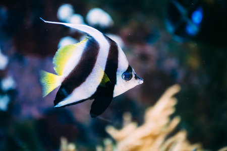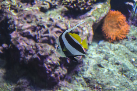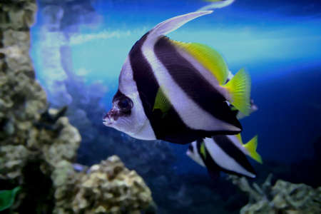 Pennant coralfish, latin name - Heniochus acuminatus. Striped marine butterflyfish with black and white vertical lines and yellow tail and fins. Sea saltwater aquarium. Shallow depth of field