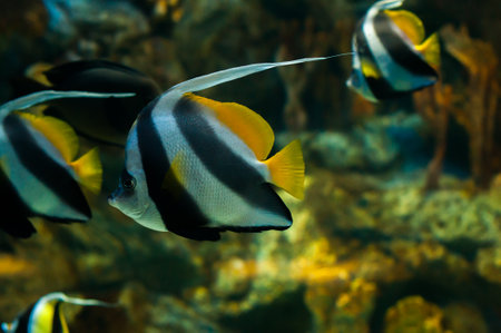 Pennant coralfish (Heniochus acuminatus), tropical fish of the family Chaetodontidae swimming in cloudy water near other fish