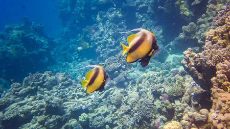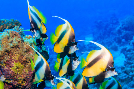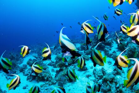Tropical Fish of Schooling Bannerfish underwater in blue water.