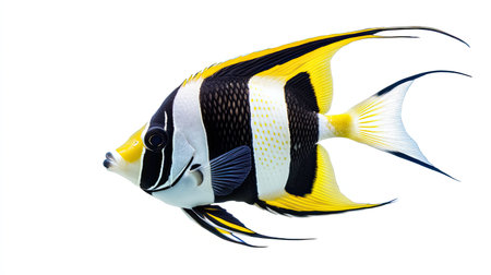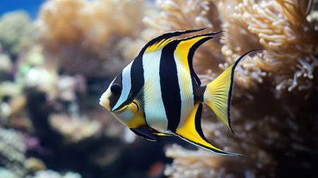 A vibrant and colorful fish showcasing striking black, yellow, and white stripes gracefully swimming in crystal-clear water, embodying marine beauty.