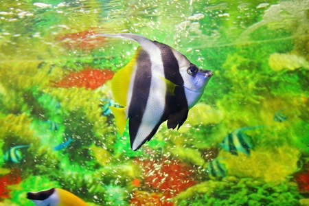 Heniochus acuminatus, tropical fish floats in the aquarium