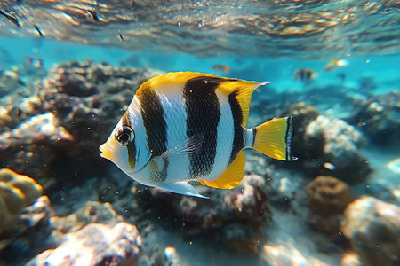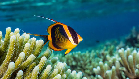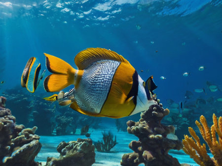 A vibrant marine fish gliding through the colorful coral reef, showcasing the beauty of underwater ecosystems. Perfect for ocean-themed projects.