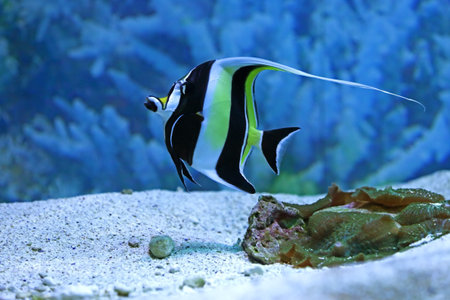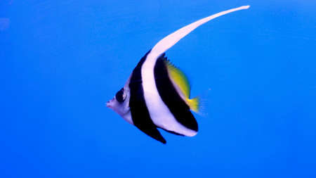 Heniochus acuminatus in blue aquarium fish tank. It is also known as pennant coralfish, reef bannerfish, longfin bannerfish or coachman.