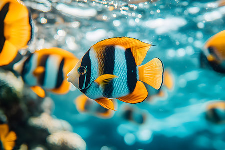 AI Generated. Vibrant Striped Tropical Fish Swimming in Underwater Reef Ecosystem