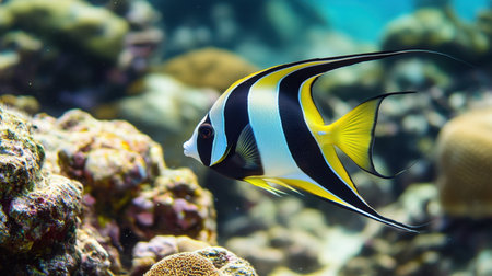 A stunning tropical fish gracefully swims through vibrant coral reefs, showcasing its colorful patterns in clear ocean waters, highlighting marine biodiversity.