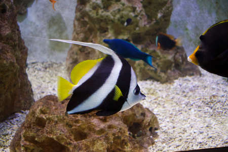 tropical. exotic black and white fish with yellow fins in an aquarium, pennon butterfly Belopera, photography