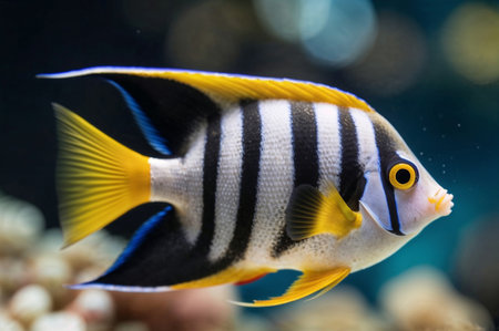 This stunning image captures a vibrant fish swimming elegantly through the dark waters, showcasing brilliant yellow, black, and white stripes.
