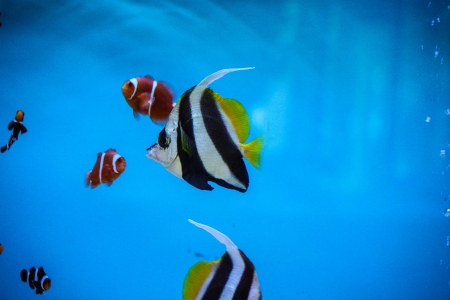 Beautiful fish in the blue water of the aquarium. Underwater world, ocean, marine life