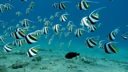 A school of pennant coral fish swimming peacefully in the Indian Ocean against dark background