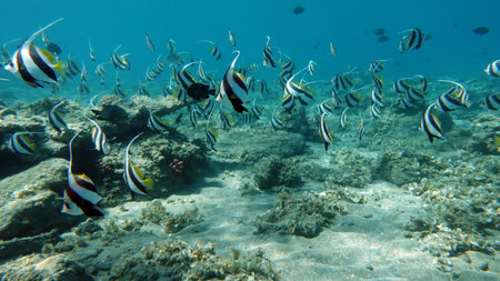 Fish of the Red Sea. Red Sea Bannerfish (Heniochus intermedius), Fish swim over a coral reef