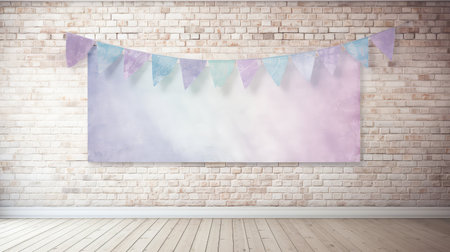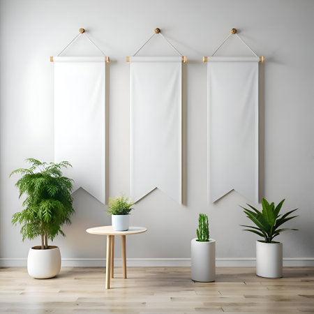 Three blank white banners hanging on a white wall with wooden dowels. perfect for showcasing your brand or message. The minimalist design and cozy atmosphere are ideal for adding a touch of modern elegance to your design projects.
