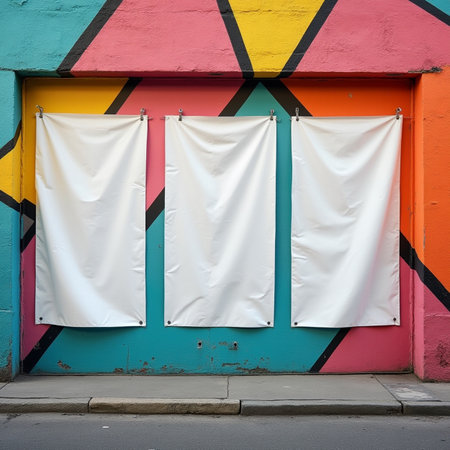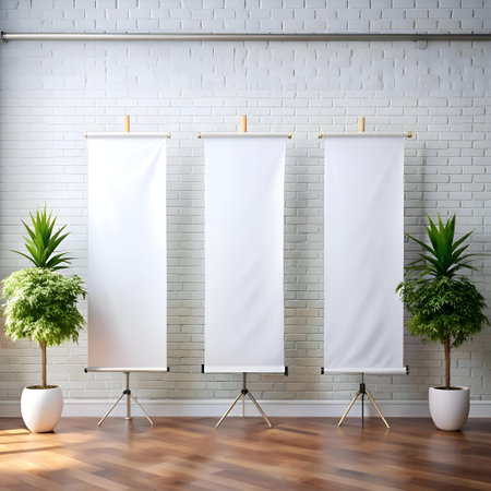 Three blank white banners on metal stands against a white brick wall. Perfect for showcasing your design. logo. or message.