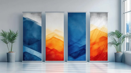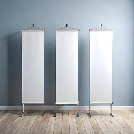 Three blank roll up banners stand against a textured blue wall. ready to be customized with your message. Perfect for showcasing your brand. promoting an event. or presenting a product.