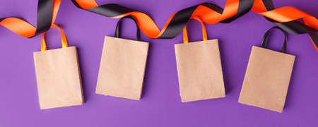 Halloween decor or sale concept, shopping pack, decorative ribbon in tradition color hanging on the purple wall. Easy crafts for kids. Copy space, October holiday banner, festive party idea