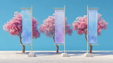 This image showcases vibrant cherry blossom trees flanking colorful banners against a clear blue sky, creating a serene and inviting atmosphere.