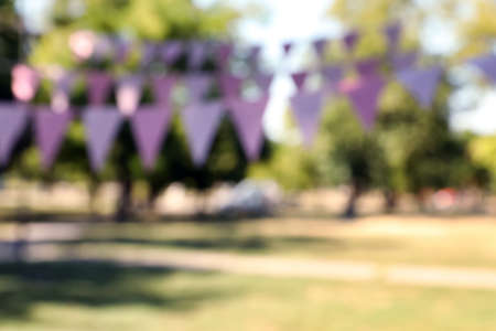 Buntings with colorful triangular flags hanging on light blue background. Festive decor