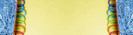 A banner with a view of colored metal clips arranged tightly to each other on a yellow background from the ends of the banner. Above them is a package with ordinary paper clips. Free space for copying, design or text