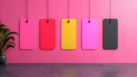 Five colorful labels in bright pink, red, yellow, pink, and black hang from a pink wall. A lush green plant is positioned beside them, creating a lively, inviting atmosphere.