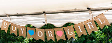 Decorative flags hanging from a backyard tent during a gender reveal baby party.