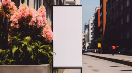 Vertical billboard near vibrant pink flowers ai mock generatedup photography. City street nature. Sidewalk advertising template outdoors. Urban promotional concept mock up photorealistic image