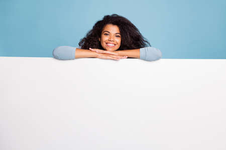 Photo of cheerful positive nice pretty sweet girlfriend leaning on to white blank banner smiling toothily beaming isolated pastel blue color background