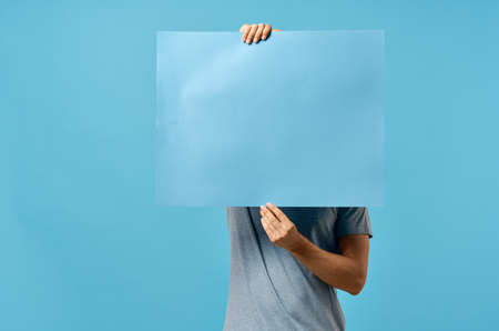 The image features a person holding a blank sign in front of a white background. The individual is wearing a gray shirt and is holding the sign with both hands. The sign is rectangular and white, standing out clearly against the plain background. This image is ideal for various design and marketing purposes.
