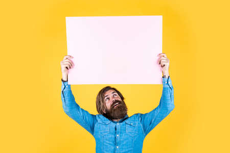 mature bearded guy has long hair hold paper placate, copy space, promotion