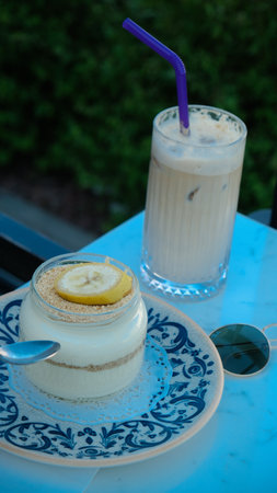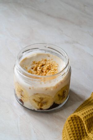 Homemade Banana Custard Pudding with Almond Milk, Chocolate Cake Gluten Free, Vegan and Hazelnut Powder Topping / Turkish Magnolia Dessert. Healthy Organic Dessert.