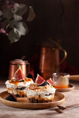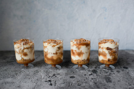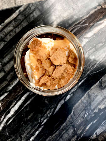 Baklava Crunch Dessert with Chocolate Mousse and Milk Cream in Jar / Custard Sponge Pudding. Healthy Organic Dish.