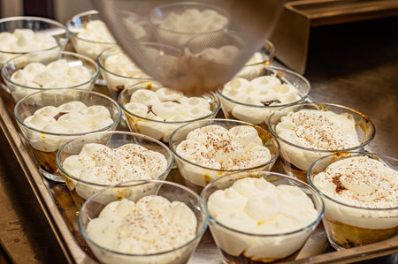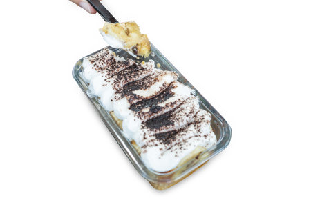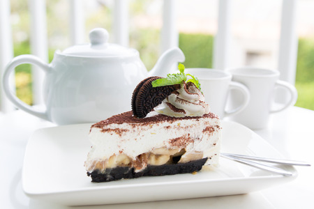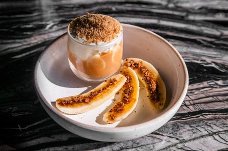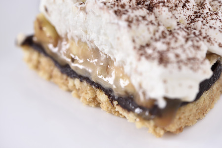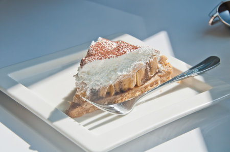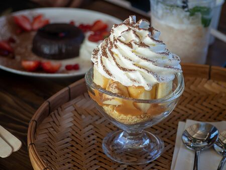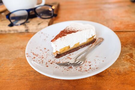 Banoffee cake with bananas and whipped cream in cafe restaurant, stock photo