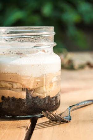 Strawberry dessert with chocolate chips, banana and sour cream in the glass.