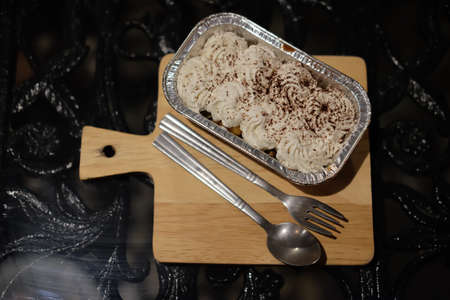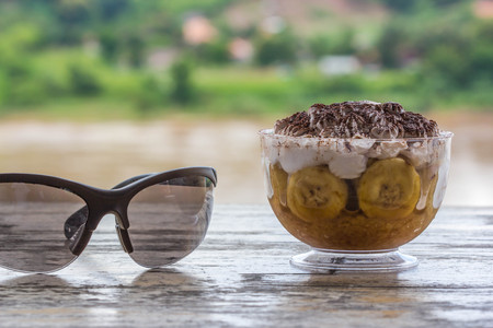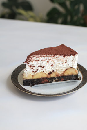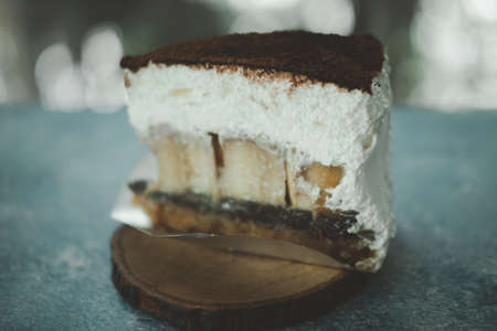 Chocolate bananas custard layer cake cake stuffed with banana flavored cream topping icing on wooden dish plate at cafe coffee shop and restaurant in Udon Thani, Thailand