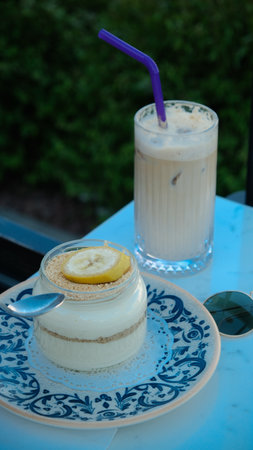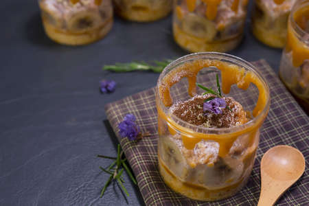 Banoffee Cake with caramelize bananas in cup and ice tea on wood table,Sweet Homemade