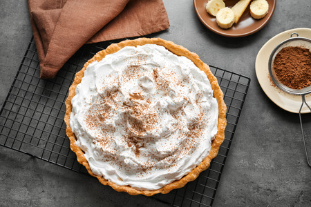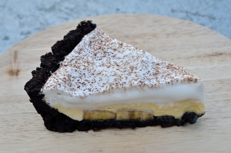 Banoffee Pie, whipped cream and banana on the wooden plate