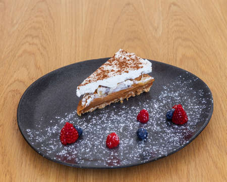 Slice of caramel and nut pie topped with a layer of cream, decorated with berries and powdered sugar. High quality photo