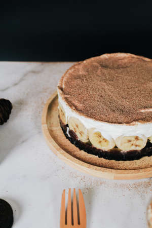 Banoffee cake with bananas, whipped cream, chocolate, caramel, coffee and toffee in cafe restaurant