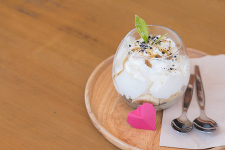 Ice cream dessert and cup of coffee on the table in a cafe. Toned picture