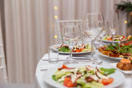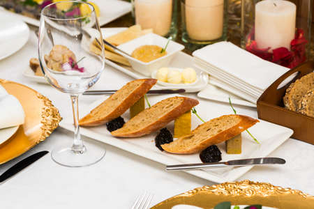 Served for holiday banquet restaurant table with dishes, snack, cutlery, wine and water glasses. European food.