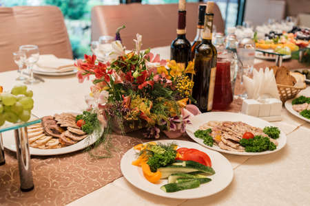 Table with food and drink on wedding. Served and decorated table in restaurant