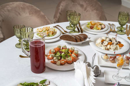 delicious dishes on the table in the restaurant. serving table. sharpness on glasses