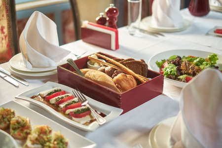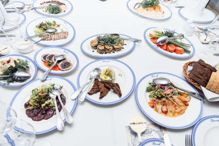 Variety of tasty cold snacks served on white ceramic plates over wedding banquet special occasion table. Assortment of cooked snacks and food on table in restaurant. Christmas or New Year celebration.