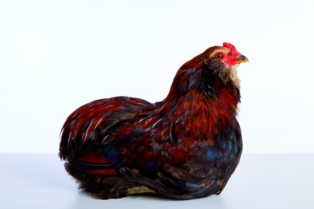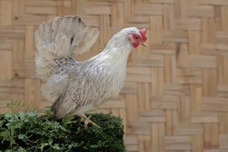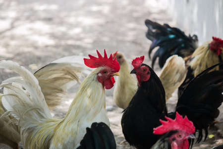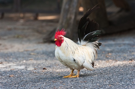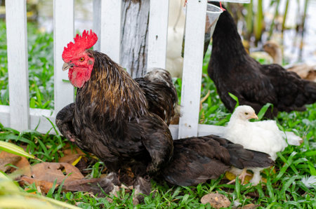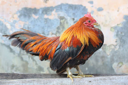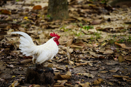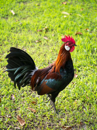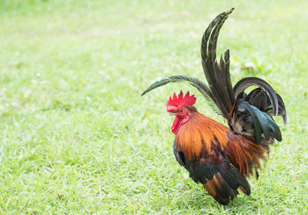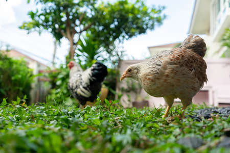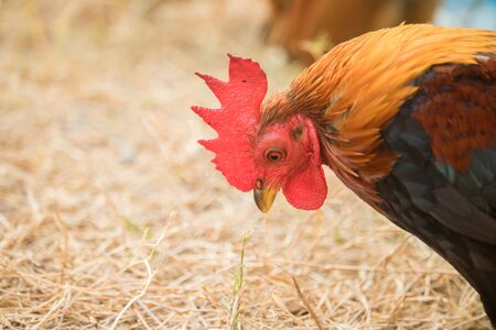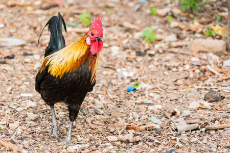 Thai hen or Bantam Chicken male look for food at plantation farm.