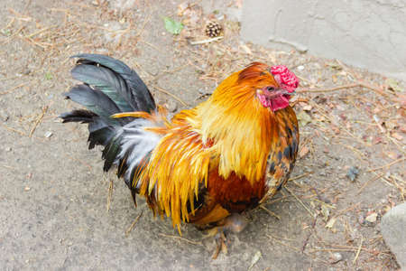 Beautiful portrait of a rooster. A rooster walks on the ground.