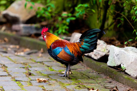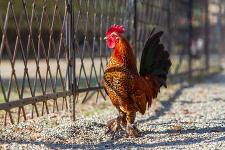 Beautiful rooster standing on the ground in the garden. Colorful rooster.
