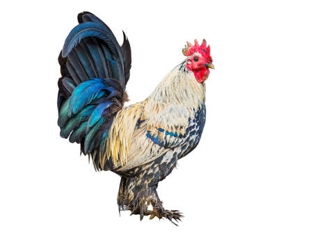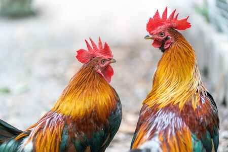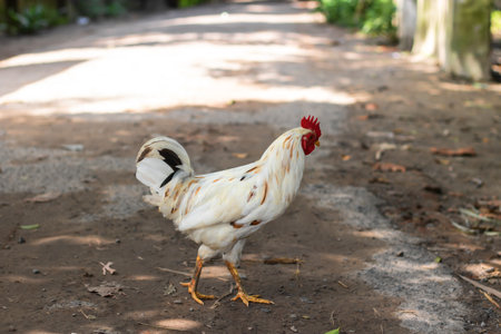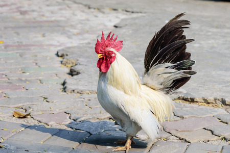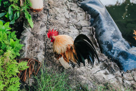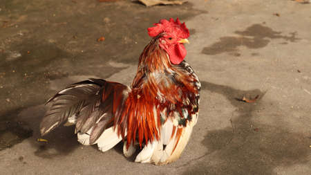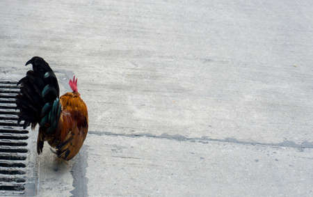 Rooster (also known as a cockerel or cock) in countryside open farm, Beautiful male chicken walking on cement floor.
