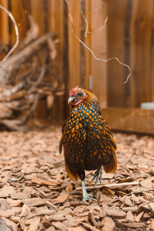 A vibrant hen struts confidently through a rustic outdoor environment with wood chips scattered around, showing its beautiful feathers and charming demeanor.