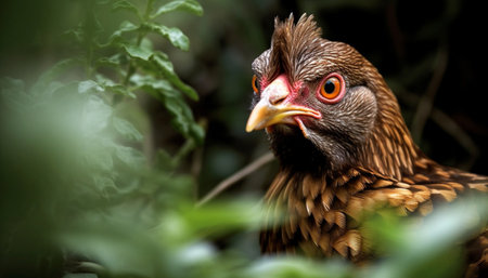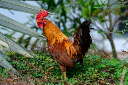 A vibrant rooster with striking red and orange plumage stands alert among dense green foliage and natural undergrowth. The scene highlights the birds colorful feathers and the textured rural environment, with soft daylight filtering through surrounding plants.