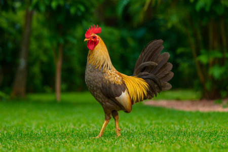 AI-Generated image of a graceful rooster standing proudly on bright green grass with a lush, blurred garden backdrop. Its body feathers display a warm gradient from soft golden yellow at the neck.